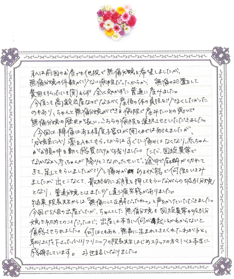 今回で5人目の出産でしたが、ちゃんとした無痛分娩も回旋異常も吸引分娩も初めてのことだったので、出産は本当に何が起こるかわからないと痛感させられました。何はともあれ、無事に生まれてきてくれたわが子と、取り上げて下さった小川クリニックの院長先生はじめスタッフの方々には本当に感謝しています。 お世話になりました。