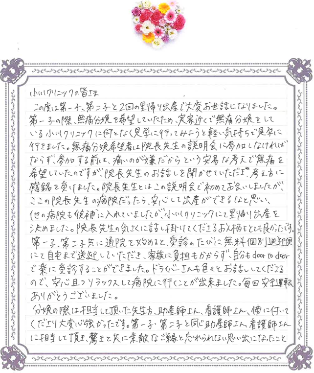 健診が終わったら行くことはないかと思うと、 寂しさが残りますが、出産の良い思い出が小川クリニックで本当に良かったです。長々と書いてしまいましたが、我が子二人が小川クリニックで無事に出産できたこと、本当に感謝しております。ありがとうございました。これからの益々のご発展を応援しております。