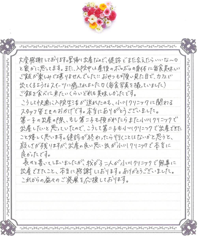 こうして快適に入院生活が送れたのも、小川クリニックに関わる スタッフ皆さまのおかげです。本当にありがとうございました。第一子の出産の際、もし第二子も授かれたらまた小川クリニックで出産したいと思っていたので、こうして第二子も小川クリニックで出産できたこと嬉しく思います。