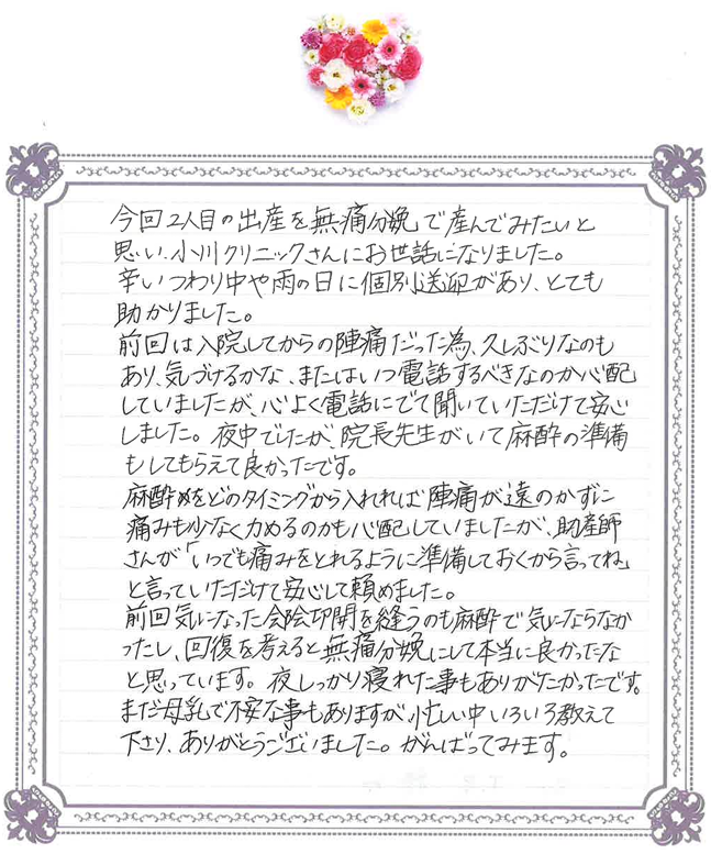 今回2人目の出産を無痛分娩で産んでみたいと思い、小川クリニックさんにお世話になりました。辛いつわり中や雨の日に個別送迎があり、とても助かりました。