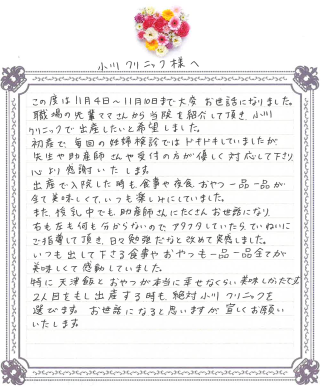この度は11月4日~11月10日まで大変お世話になりました。職場の先輩ママさんから当院を紹介して頂き、小川クリニックで出産したいと希望しました。