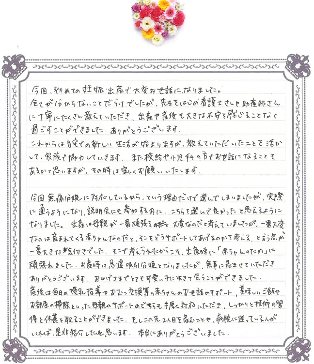 今回、初めての妊娠・出産で大変お世話になりました。全てが分からないことだらけでしたが、先生をはじめ看護士さんや助産師さんに丁寧にたくさん教えていただき、出産や産後も大きな不安を感じることなく過ごすことができました。ありがとうございます。