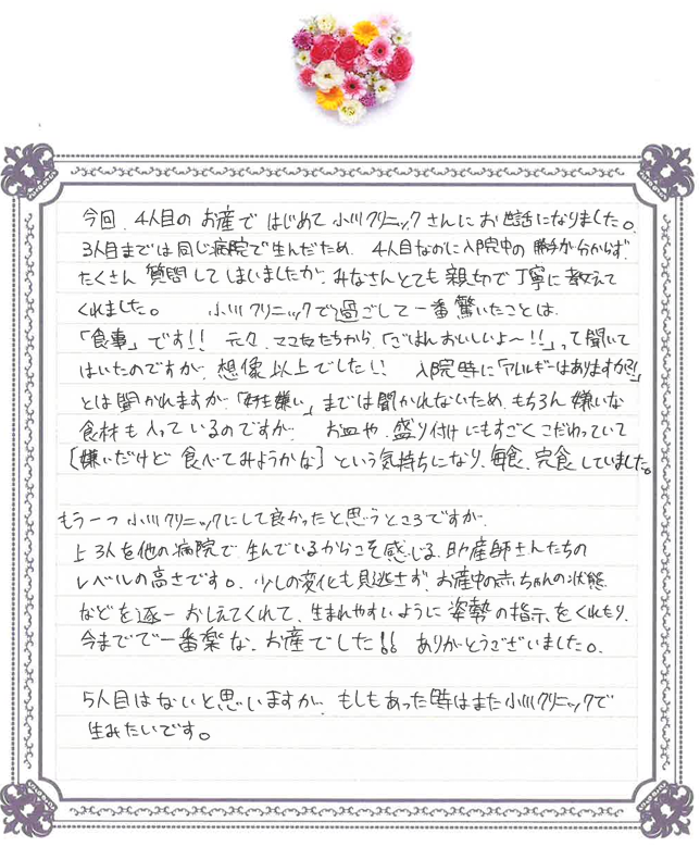 今回、4人目のお産ではじめて小川クリニックさんにお世話になりました。3人目までは同じ病院で生んだため、4人目なのに入院中の勝手が分からずたくさん質問してしまいましたが、みなさんとても親切で丁寧に教えてくれました。