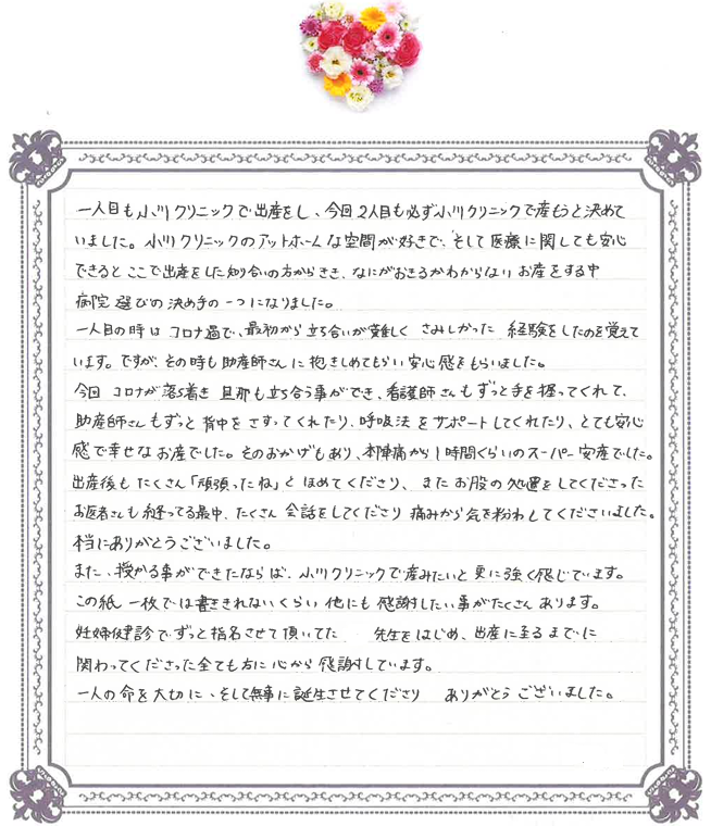 また、授かる事ができたならば、小川クリニックで産みたいと更に強く感じています。この紙一枚では書ききれないくらい他にも感謝したい事がたくさんあります。妊婦健診でずっと指名させて頂いてた先生をはじめ、出産に至るまでに関わってくださった全ても方に心から感謝しています。一人の命を大切に、そして無事に誕生させてくださりありがとうございました。