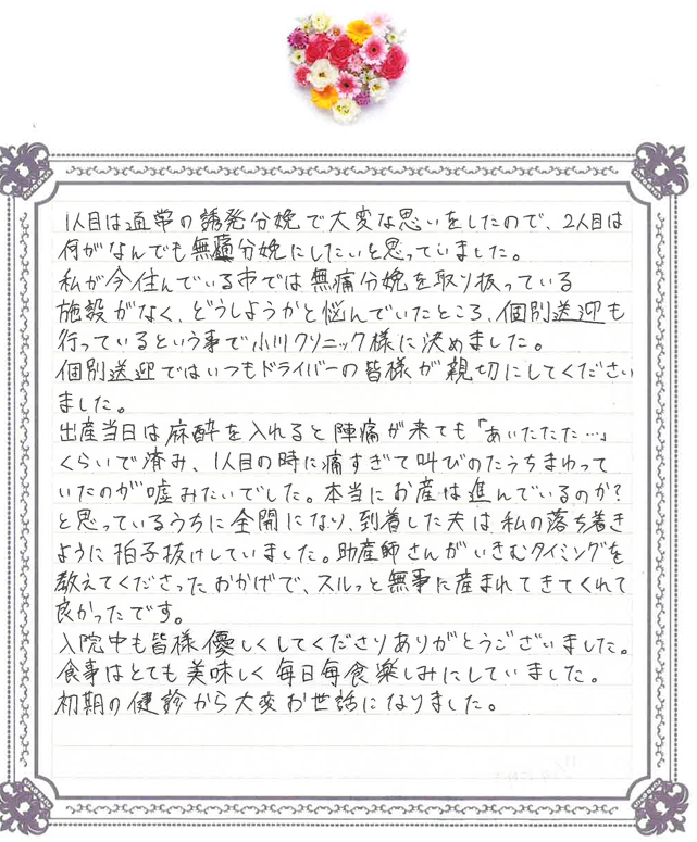 『私が今住んでいる市では無痛分娩を取り扱っている施設がなく、どうしようかと悩んでいたところ、 個別送迎も行っているという事で小川クリニック様に決めました。 個別送迎ではいつもドライバーの皆様が親切にしてくださいました。 』