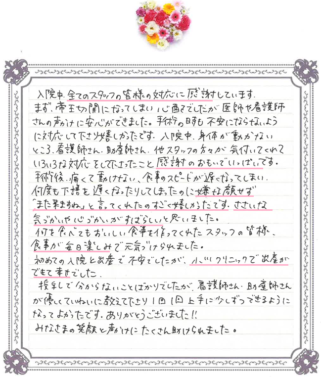 入院中、身体が動かないところ、看護師さん、助産師さん、他スタッフの方々が気付いてくれていろいろな対応をして下さったこと感謝のおもいでいっぱいです。