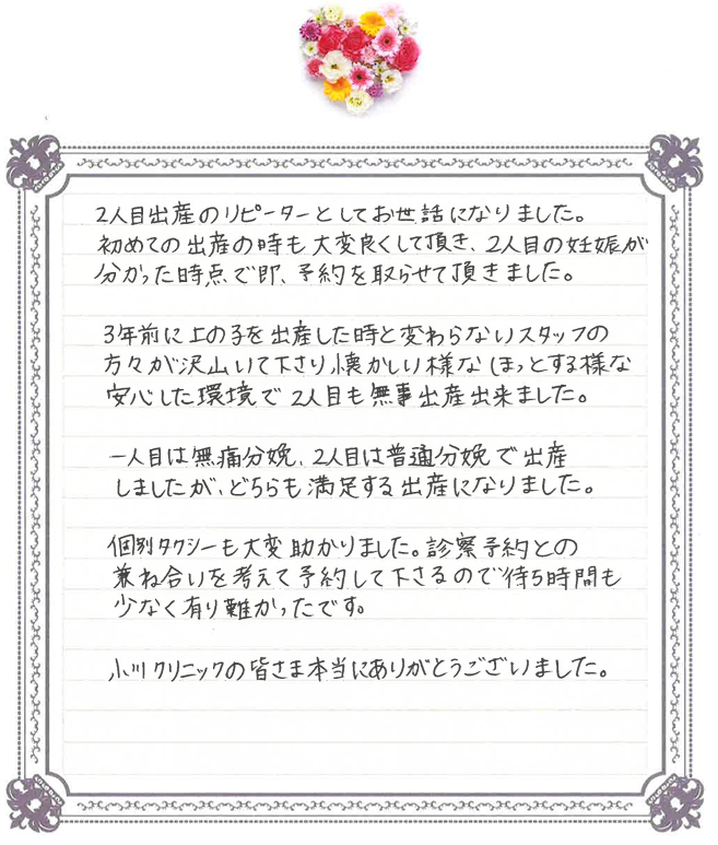 2人目出産のリピーターとしてお世話になりました。初めての出産の時も大変良くして頂き、2人目の妊娠が分かった時点で即、予約を取らせて頂きました。