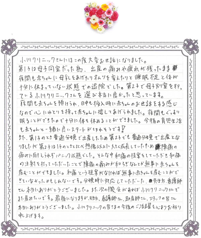 分娩時に対応していただいた。先生方、看護師さん本当にありがとうございました。また次の機会があれば小川クリニックさんでまた産みたいです。最後になりますが、先生方、看護師さん、助産師さん、スタッフの皆さん本当にありがとうございました。小川クリニックの皆さまの今後のご活躍を心よりお祈り申し上げます。
