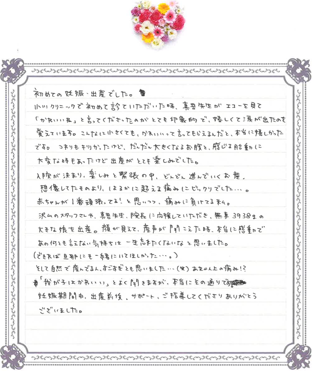 『小川クリニックで初めて診ていただいた時、先生がエコーを見て「かわいいね」と 言ってくださったのがとても印象的で、嬉しくて涙が出たのを覚えています。』