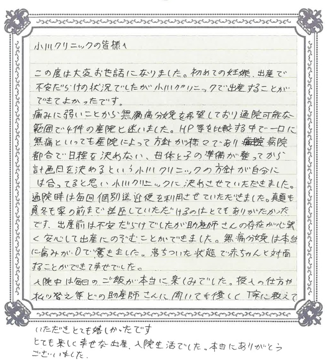 この度は大変お世話になりました。初めての妊娠、出産で不安だらけの状況でしたが小川クリニックで出産することができてよかったです。