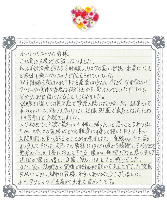 『双子妊婦を受け入れて下さる産院は少ないですが、今までの小川クリニックの実績や高度な技術力から、受け入れていただけると分かり、お世話になることを決めました。』