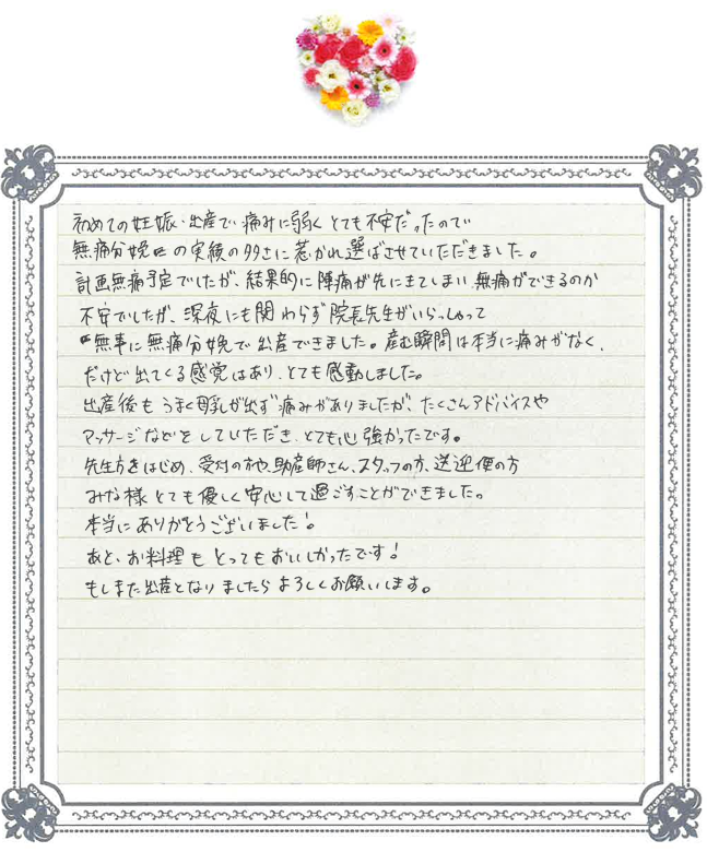 計画無痛予定でしたが、結果的に陣痛が先にきてしまい、無痛ができるのか不安でしたが、深夜にも関わらず院長先生がいらっしゃって無事に無痛分娩で出産できました。産む瞬間は本当に痛みがなく、だけど出てくる感覚はあり、とても感動しました。