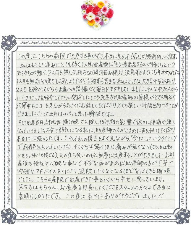 この度は、こちらの病院で出産する事ができ、本当に良かったです。心より感謝申し上げます。私はもともと痛みにとても弱く、1人目の出産後は「もう一度出産するのが怖い」という気持ちが強く、2人目を望む気持ちとの間で悩み続け、決意するまでに5年かかりました。