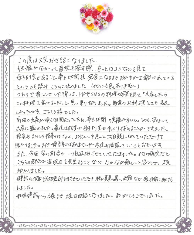 また、今回、家の都合で一泊延泊させていただきました。他の病院だとこちらの都合で退院日を変更することなどなかなか難しいと思うので、大変助かりました。