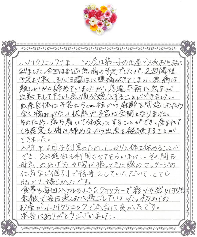 小川クリニックさま。この度は第一子の出産で大変お世話になりました。今回は計画無痛の予定でしたが、2週間程予定より早く、また日曜日に陣痛がきてしまい、無痛は難しいかと諦めていましたが、急遽早朝に先生が出勤をして下さり無痛分娩をすることができました。