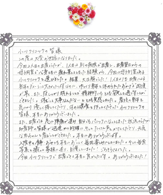 今回2人目の出産でしたが、1人目は別の病院で出産し、出産翌日からの母子同室で心身ともに疲れ果ってしまった経験から、今回は母子別室である小川クリニックを選びました。結果、大正解でした!1人目よりも出産による身体のダメージは大きかったはずなのに、ゆっくり身体を休められたおかげで回復が早く、また、夜しっかり眠れることで精神的にもとても安定して過ごすことができました。休むって大事なんだな…ととても実感しました。産後の身体を気にかけ優しく接してくださり、休める環境を作ってくださった小川クリニックの皆様、本当にありがとうございました。